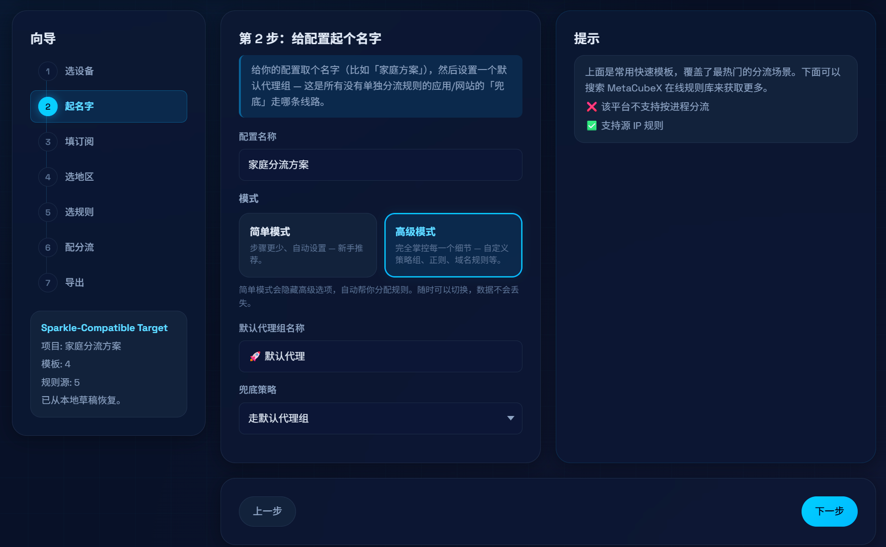 适合:愿意点向导、说清楚分流意图,希望少碰裸 YAML 的人;需要同时在路由 / PC / 多客户端间统一思路再分别导出的人。